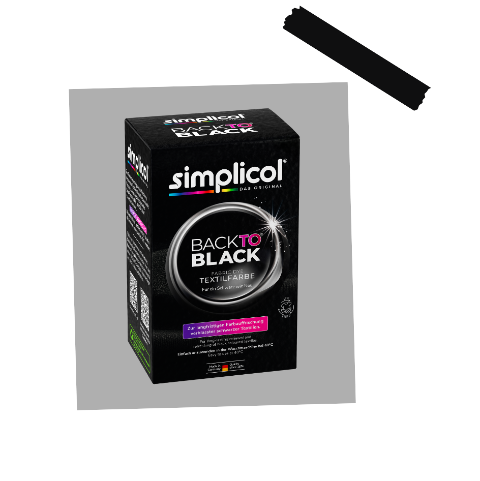 Verblasste schwarze Kleidung gehört der Vergangenheit an – mit simplicol Back to Black erstrahlen deine Lieblingsstücke wieder in tiefstem Schwarz. Dieses innovative Färbemittel wurde speziell entwickelt, um verblassten Textilien ihre ursprüngliche Farbintensität zurückzugeben.